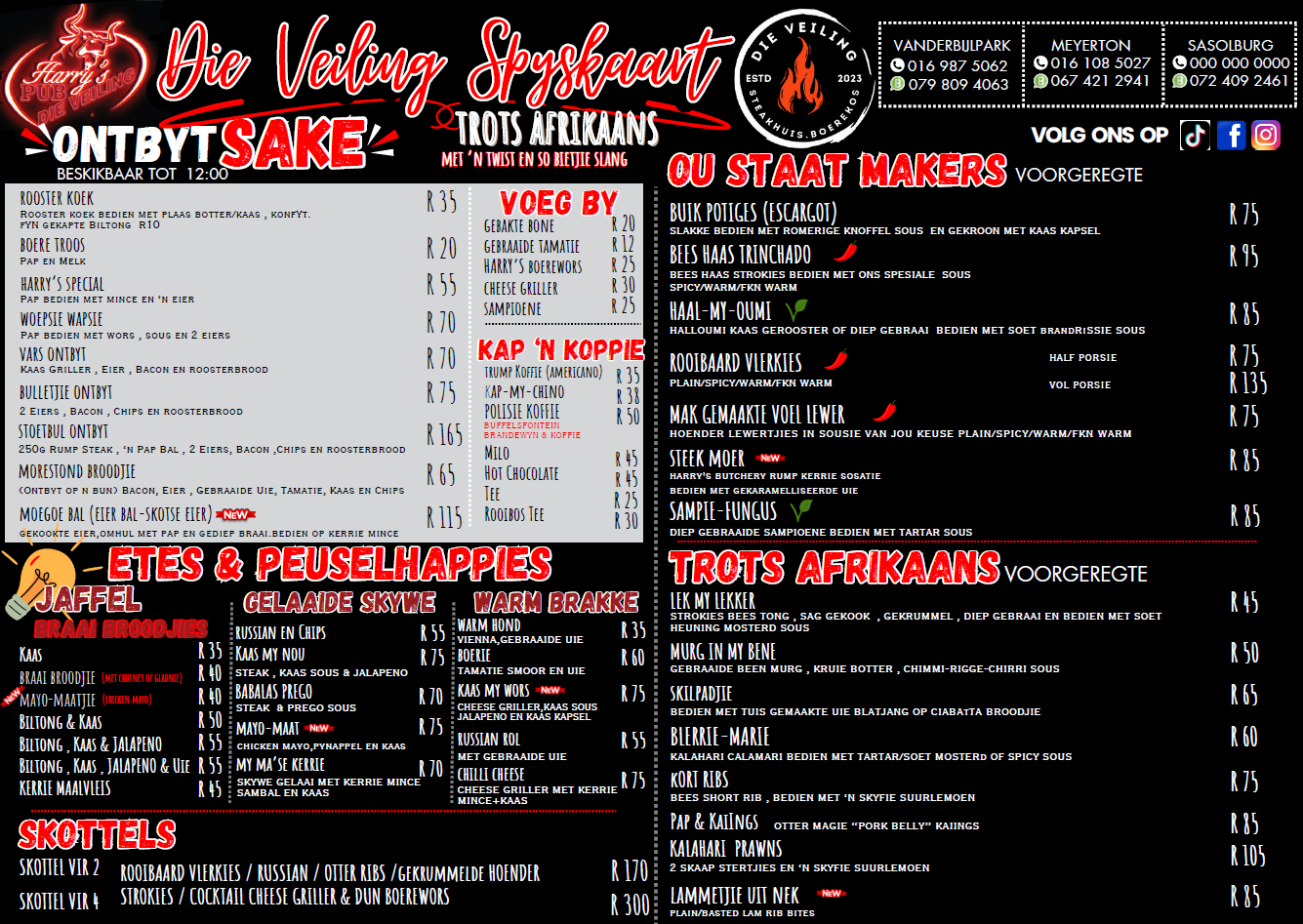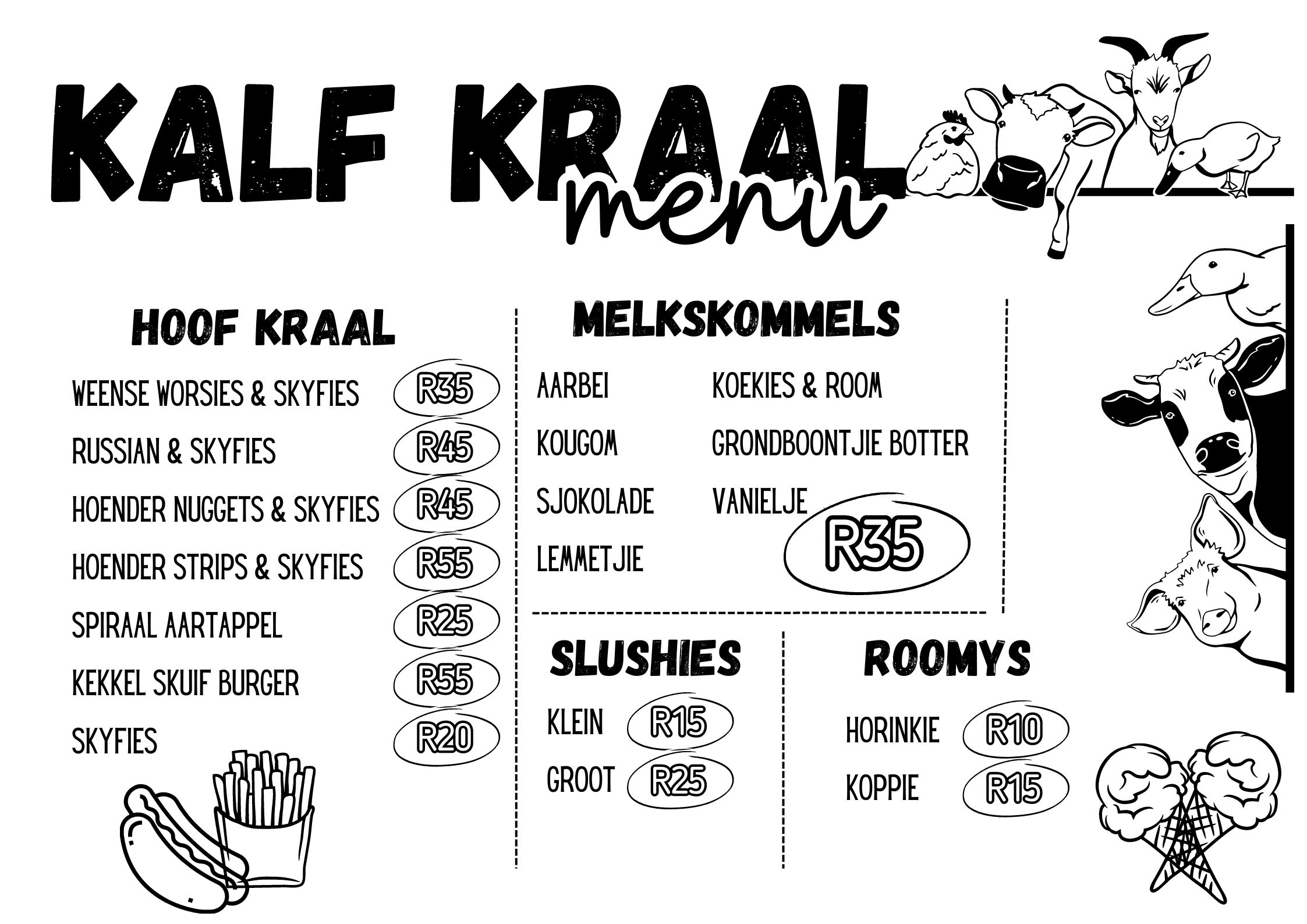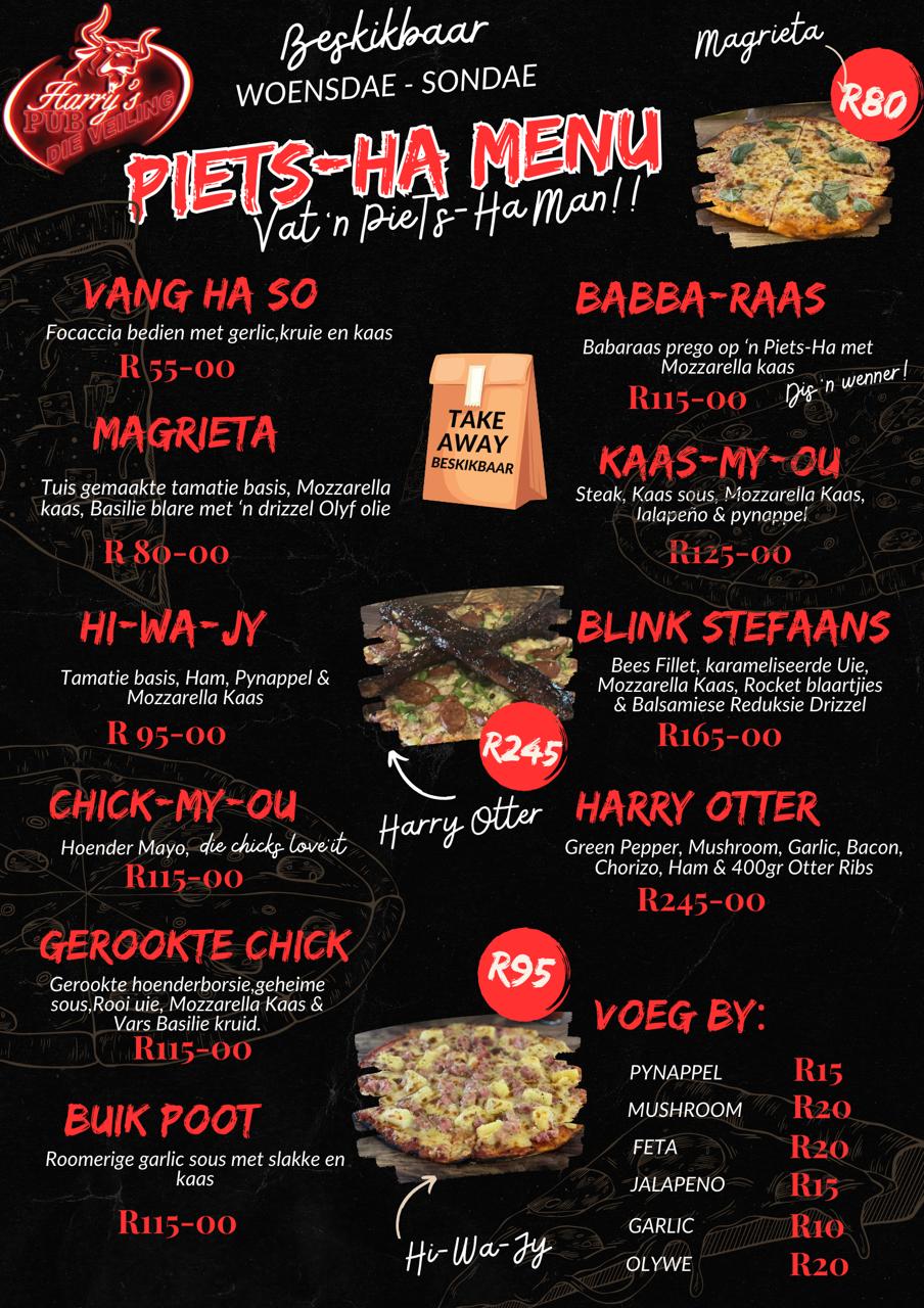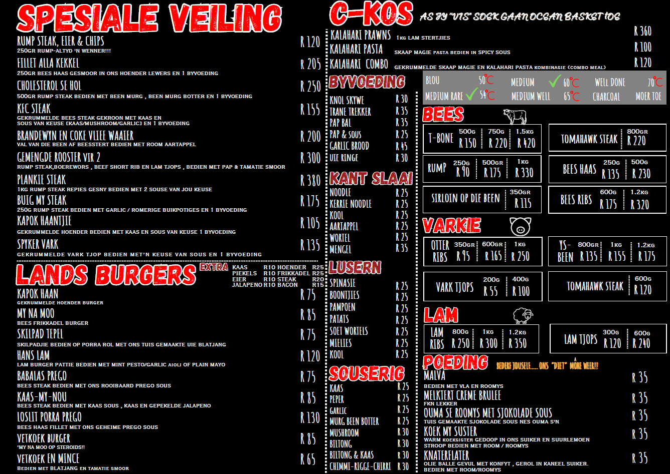 By Die Veiling is ons trots daarop om ’n uiteenlopende spyskaart aan te bied wat gevul is met egte boerekos en heerlike drankies. Van vullende hoofgeregte tot smaaklike happies en verfrissende drankies — daar is iets vir elke smaak. Ons spyskaart is ontwerp om ons gesinsvriendelike atmosfeer aan te vul en ’n onvergeetlike eetervaring te bied. Sluit by ons aan en geniet die smake van die huis!